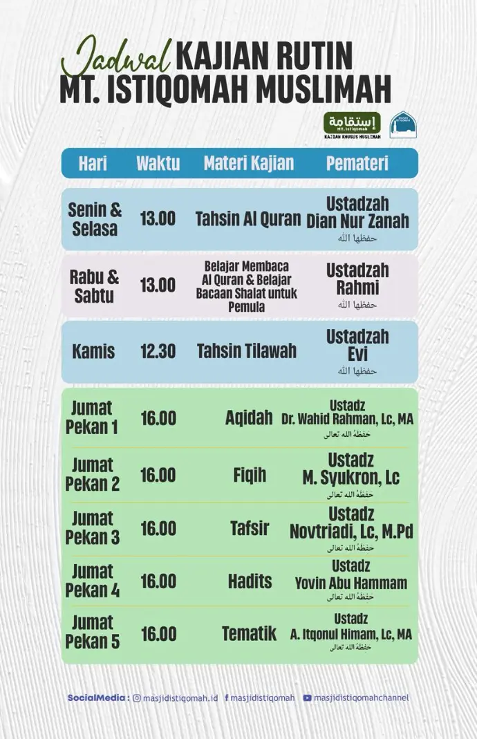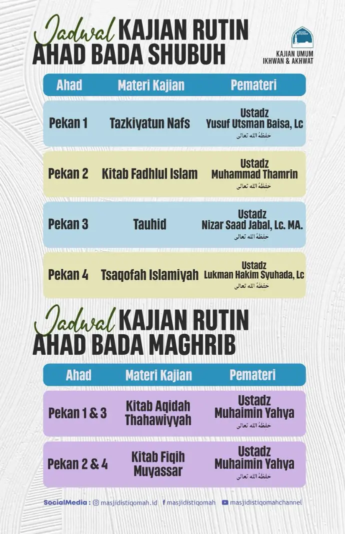 Kajian rutin diadakan setiap pekan khususnya Ahad Shubuh dan Ahad bada Maghrib. Kajian Perbulan seperti Kajian Anak dan Kajian Parenting Orang Tua Murid. - Buka Puasa Bersama